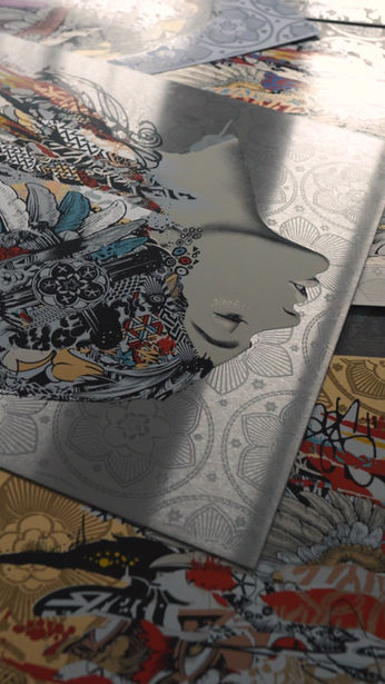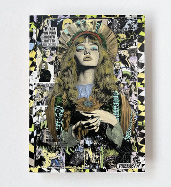 Weaving small pieces of popular culture; money, street, religious, musical and political affiliations, into visually beautiful allegorical portraits, PREFAB77 expresses an abstract idea or convey a meaning not explicitly set forth in the narrative. A modern fable, a story or a warning, often political, sometimes anti-establishment but always beautiful.