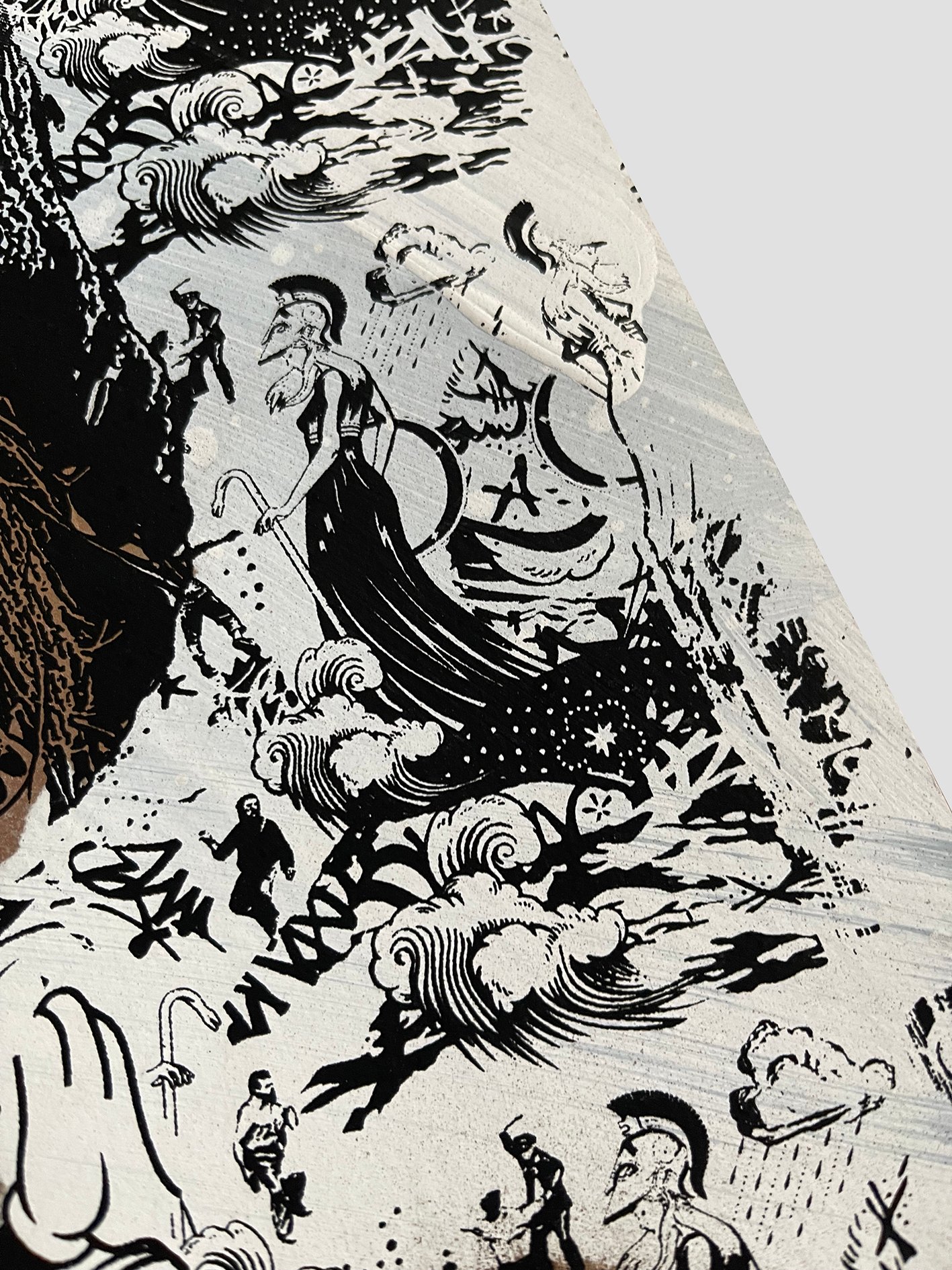 a hand painted background with a 2 color metallic sprayed stencil, finished with a luxurious layer of UV ink on 290gsm Fabriano paper